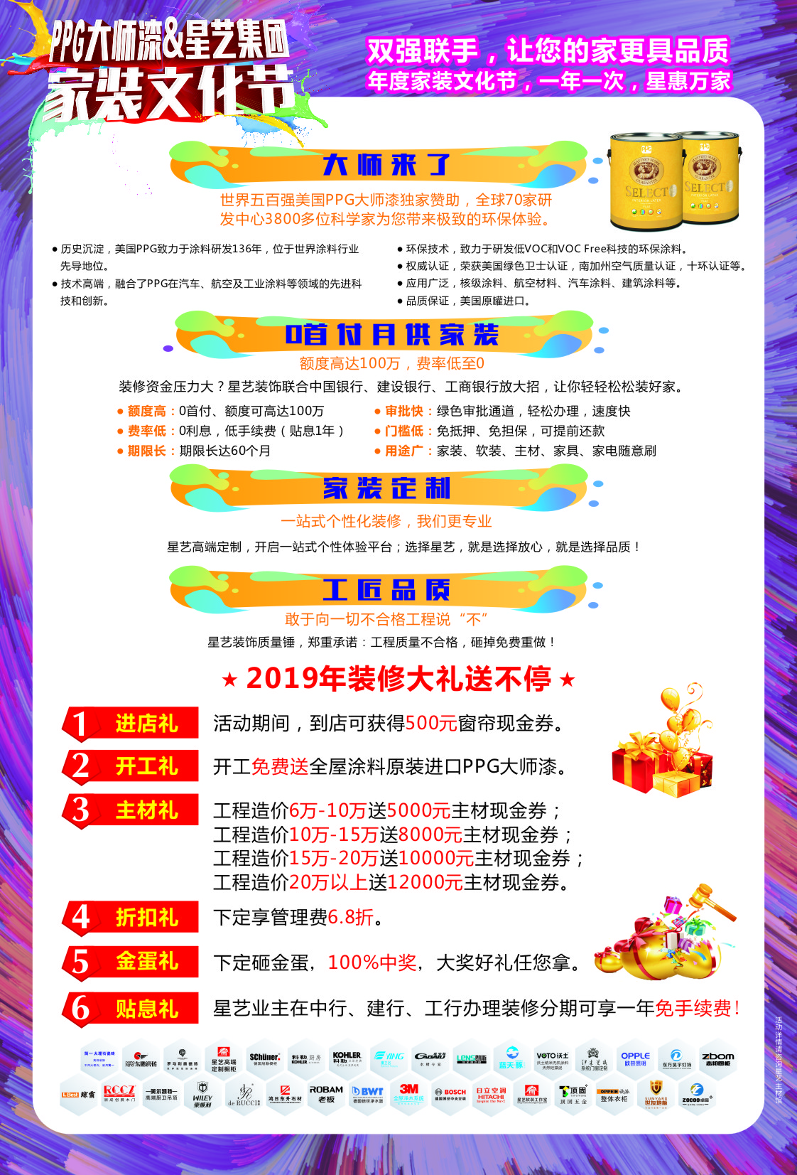 本次家裝文化節(jié),星藝裝飾攜手世界五百強美國PPG大師漆合力打造,助力高端品質(zhì)環(huán)保家裝。美國PPG大師漆精研涂料136年,位于世界涂料行業(yè)先導地位。其采用美國PPG創(chuàng)新技術(shù),無甲醛、苯、香精、遮味劑添加,榮獲美國綠色衛(wèi)士認證,南加州空氣質(zhì)量認證,十環(huán)認證等,為您帶來非凡的高品質(zhì)環(huán)保體驗。美國PPG大師漆原裝進口,漆膜細膩、高效防霉抗污,遮蓋力強,全方位保護家居墻面;多種光澤+PPG色彩之聲1800種顏色,繽紛家居持久靚麗,打造高品質(zhì)墻面。